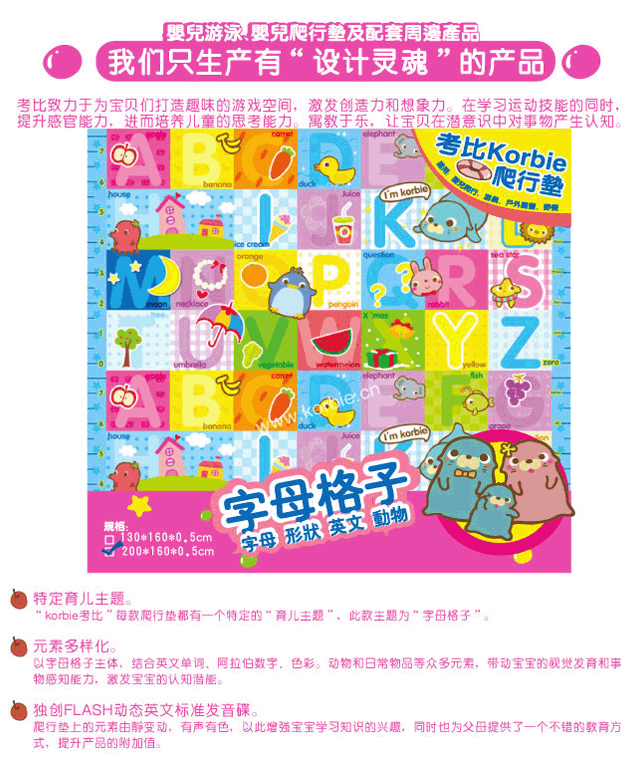 “考比Korbie”嬰兒爬行墊,是杭州杰弗瑞嬰童用品有限公司旗下的主打品牌產品。Korbie,源自德文“korb”,是“籃子”的意思?急菿orbie,給爸爸媽媽一個放心的“籃子”,為寶寶的成長創(chuàng)造一個安全、舒適和快樂的小天地。