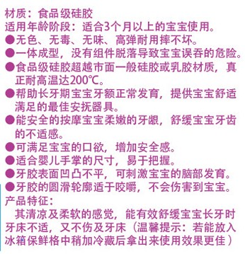 本品采用高級食品級矽膠(Liquid Silicone)制成,無毒、無味、耐高溫120℃可消毒、極好韌性、不易破、更耐用。本品對嬰兒牙床的發(fā)育和牙齦的保護有特殊效果。能促進嬰兒牙齒的正常發(fā)育及臉部肌肉運動。