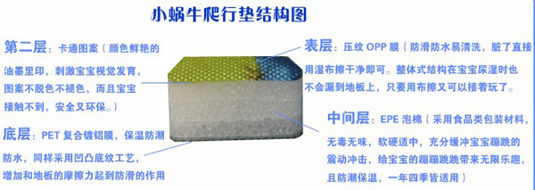 小蝸牛爬行墊無毒無味,防潮隔濕,超大無縫,表面附帶精美的童話圖案,從寶寶學爬到練習走路,再到大點在地上玩耍蹦跳,都是不錯的選擇,是寶寶健康快樂成長的好伴侶。