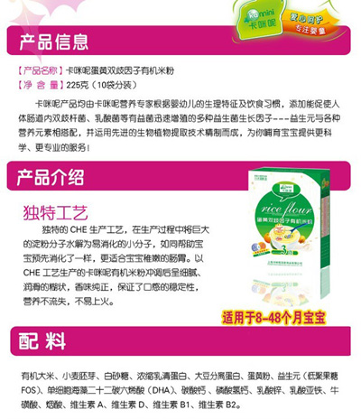 卡咪呢有機米粉系列是專為中國寶寶設(shè)計的營養(yǎng)輔食,選用有機大米,科學(xué)搭配維生素AD等維生素,還特別添加牛磺酸、DHA、AA等有助智力發(fā)育的營養(yǎng)成分,富含15種營養(yǎng)素,F(xiàn)上海卡咪呢母嬰用品有限公司面向全國空白市場區(qū)域誠招卡咪呢有機米粉代理商。