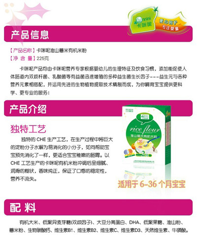 卡咪呢有機(jī)米粉系列是專(zhuān)為中國(guó)寶寶設(shè)計(jì)的營(yíng)養(yǎng)輔食,選用有機(jī)大米,科學(xué)搭配維生素AD等維生素,還特別添加;撬、DHA、AA等有助智力發(fā)育的營(yíng)養(yǎng)成分,富含15種營(yíng)養(yǎng)素。現(xiàn)上?ㄟ淠啬笅胗闷酚邢薰久嫦蛉珖(guó)空白市場(chǎng)區(qū)域誠(chéng)招卡咪呢有機(jī)米粉代理商。