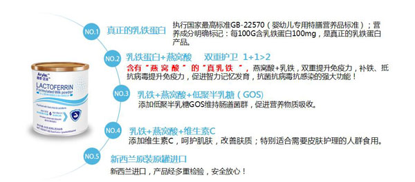 雅!に{湖乳鐵蛋白,一款新西蘭原罐原裝進口的優(yōu)質(zhì)營養(yǎng)補充品!嚴格執(zhí)行國家最高標準GB-22570(嬰幼兒專用特膳營養(yǎng)品標準);營養(yǎng)成分明確標記:每100G含乳鐵蛋白100mg。