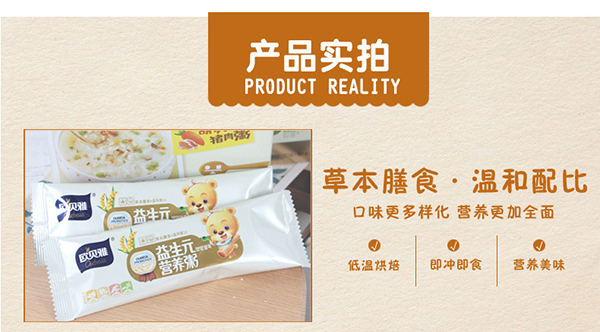 歐貝雅蛋黃玉米營養(yǎng)粥將傳統(tǒng)的營養(yǎng)米粉和聞名全國的廣東粥品完美結(jié)合起來精制而成,營養(yǎng)更豐富,口感更佳,而且免煮沖水即食,給寶寶喂食的時候不用等那么長時間,很方便。