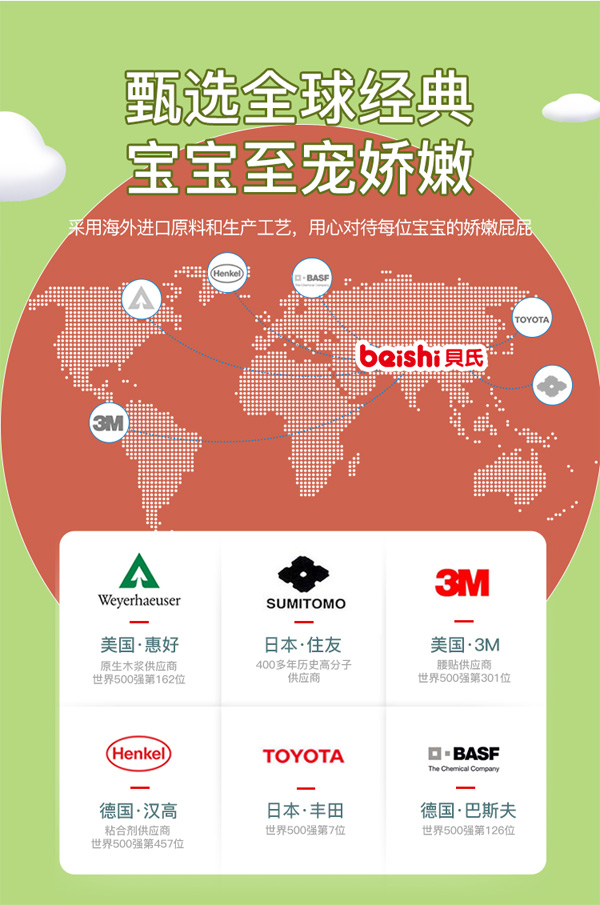 采用海外進(jìn)口原料和生產(chǎn)工藝,用心對(duì)待每位寶寶的嬌嫩屁屁