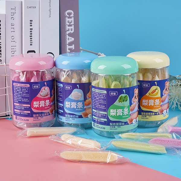 暖馨梨膏條,嚴(yán)選食材,精湛制作,有酸奶味、火龍果味、菠菜味、香蕉胡蘿卜味,共四種口味,特加入梨膏,甜蜜滋潤(rùn),好吃不膩。條狀設(shè)計(jì),大小適合。