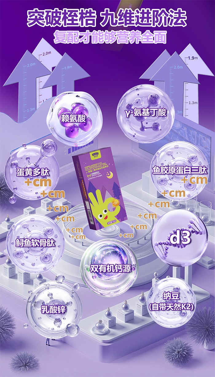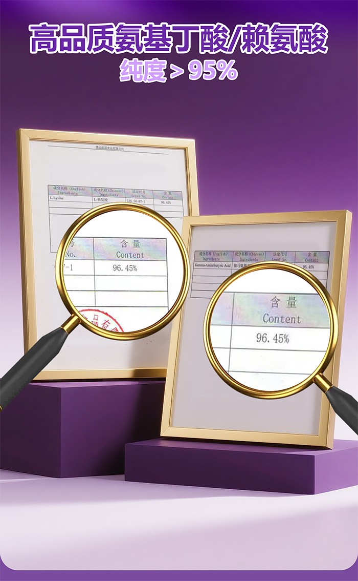 2、每袋添加95%純度以上頂高純度氨基丁酸105mg,促進(jìn)生長激素的釋放。