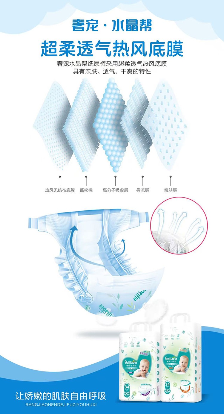 貝嬌兒奢寵水晶幫紙尿褲,采用超柔透氣熱風底膜,具有親膚、透氣、干爽的特點。親膚棉柔面層,呵護嬌嫩肌膚;0.1cm纖薄,輕薄無負擔;進口高分子,小身材大吸量;約50000個呼吸微孔,空氣循環(huán)暢通,透氣干爽,遠離紅屁屁。凸點設計,減少接觸面,及時散發(fā)悶熱潮氣。超柔超薄空氣芯,全方位瞬吸導流,拒絕鼓包,拒絕斷層,多次尿量,一片瞬吸,鎖住尿液不回滲,屁屁拒絕潮濕,整晚安睡。