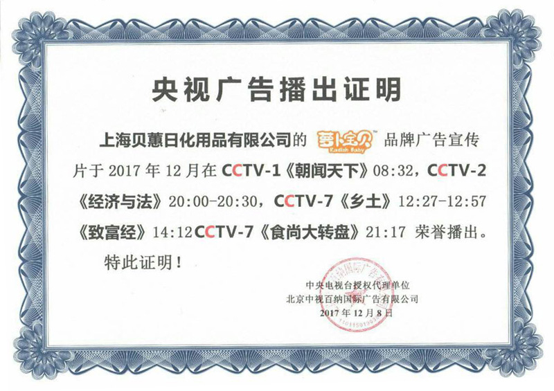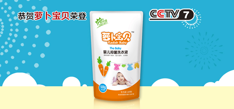蘿卜寶貝品牌榮登CCTV1,CCTV2 ,CCTV7 全面打響廣告,全面升級。以廣告中大家熟悉貫耳的“寶貝開心,媽咪放心,蘿卜寶貝洗衣液”的廣告詞,全面向全國推廣。
