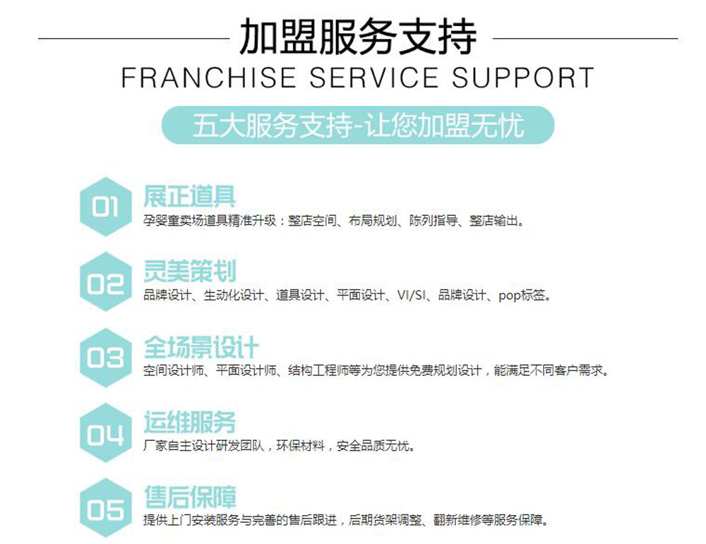 公司推出“母嬰終端零售展示道具、母嬰終端代理商、專營(yíng)店、品牌連鎖加盟的整店輸出一站式服務(wù)”。公司不但擁有高素質(zhì)的設(shè)計(jì)團(tuán)隊(duì):空間設(shè)計(jì)師、平面設(shè)計(jì)師、結(jié)構(gòu)工程師等為您提供免費(fèi)規(guī)劃設(shè)計(jì),能滿足不同客戶需求,真誠(chéng)感謝長(zhǎng)期支持和信賴,我們的朋友!