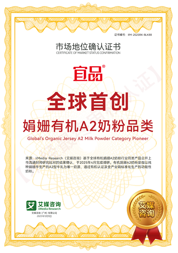 [1]iiMedia Research(艾媒咨詢)基于全球娟姍有機(jī)A2奶粉行業(yè)同類產(chǎn)品公開上市流通時(shí)間研究比對(duì)的結(jié)果確認(rèn),于2025年4月完成調(diào)研。娟姍有機(jī)A2奶粉是指以純種娟姍牛生產(chǎn)的A2型牛乳為唯一奶源,通過有機(jī)認(rèn)證及全產(chǎn)業(yè)鏈標(biāo)準(zhǔn)化生產(chǎn)的功能性奶粉。