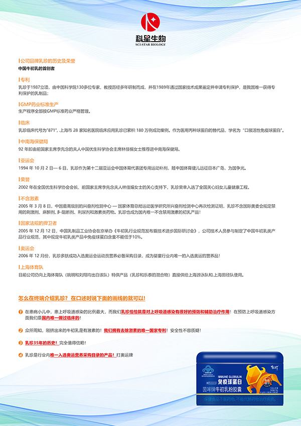 中科乳珍,中國科學(xué)院生命科學(xué)研究院研制,35年有效臨床經(jīng)驗!民族品牌,藍(lán)帽品質(zhì)!每粒含免疫球蛋白36mg,遠(yuǎn)高于市場上的同類產(chǎn)品,特采用ASP活性物質(zhì)保鮮技術(shù),為免疫力低下人群精心研發(fā)設(shè)計!嬰幼兒、兒童、成人均可食用,經(jīng)動物及功能實驗評價,具有免疫調(diào)節(jié)的保健功能!