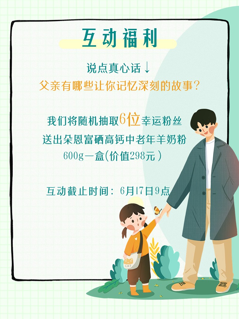 當(dāng)前位置:首頁 > 孕嬰童新聞中心 > 產(chǎn)品資訊 > 父親節(jié)將至,朵恩互動送奶粉啦!