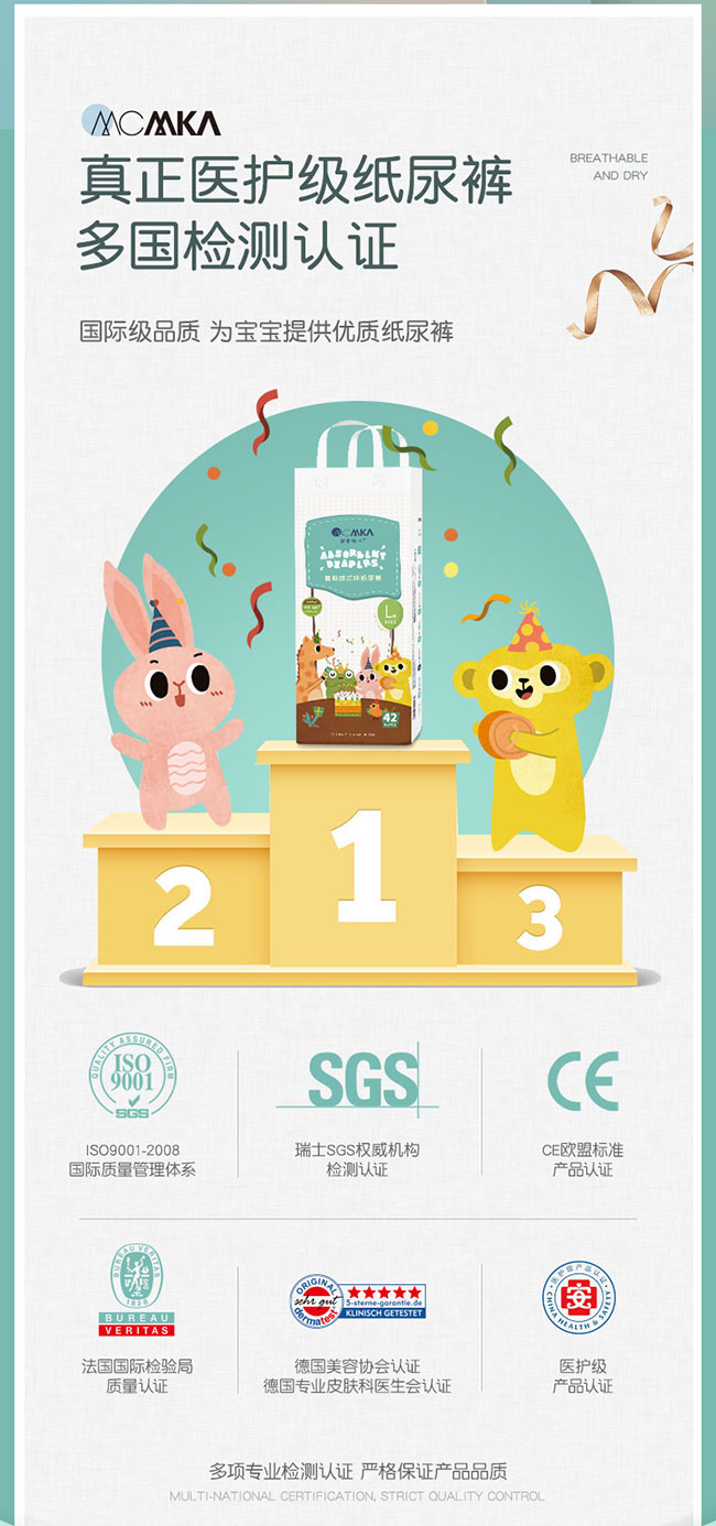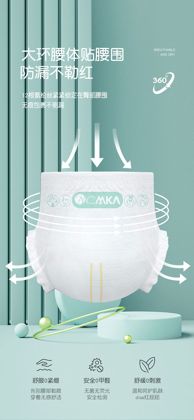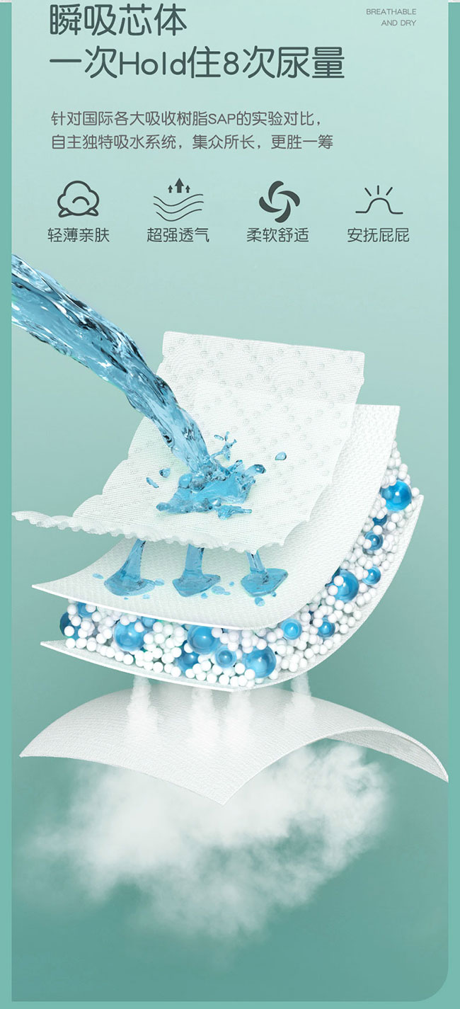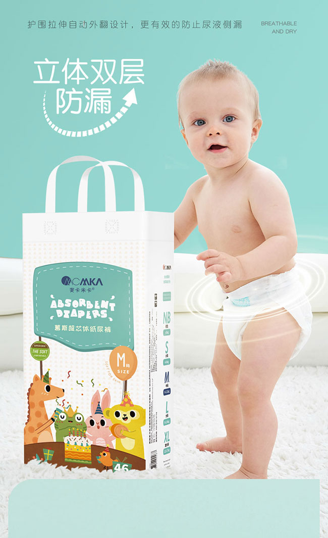 麥卡米卡慕斯超芯體紙尿褲,第4代“超芯”,更薄、更快、更干爽、更安全!獨創(chuàng)芯體U型槽,吸收更快,更大容量;超聲波壓合云朵凸點面層,減少皮膚接觸面,遠離紅屁股;大環(huán)腰體貼腰圍,防漏不勒紅;立體雙層防漏,護圍拉伸自動外翻設(shè)計,有效防止側(cè)漏;0.1cm超薄芯,一片尿褲反鎖整夜尿量;臺灣進口面層,立體打孔,輕松吸收,迅速把干;醫(yī)護級紙尿褲,多國檢測認證,安全放心。